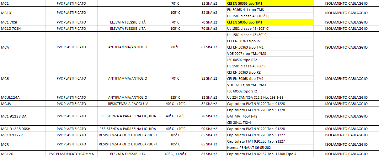 Il PVC, sigla che indica il Polivinilcloruro, è probabilmente il polimero di maggiore importanza fra tutte le materie plastiche in commercio. È caratterizzato da una straordinaria versatilità di applicazione, e tramite additivi plastificanti può essere reso altamente flessibile. Nell’ambito delle guaine isolanti per cavi e cablaggi elettrici il PVC plastificato è particolarmente apprezzato per le sue caratteristiche di isolamento e autoestinguenza e ritardo di fiamma; oltre a questo, può essere prodotto in vari colori brillanti, che lo rendono ideale per identificare il percorso di diversi cavi all’interno dei cablaggi.